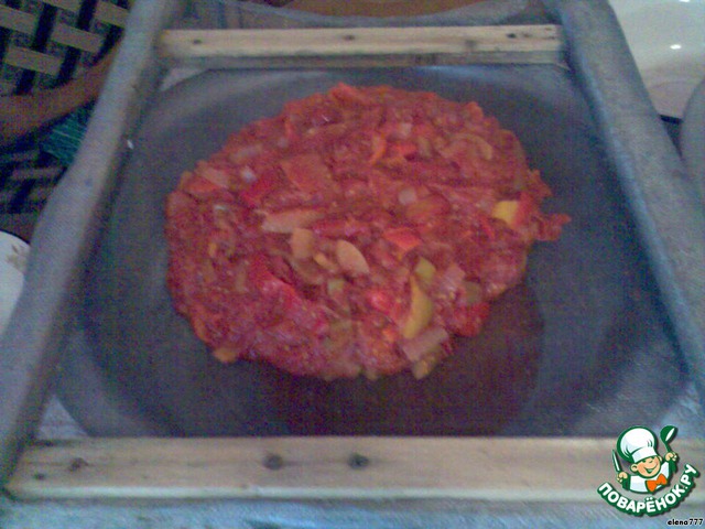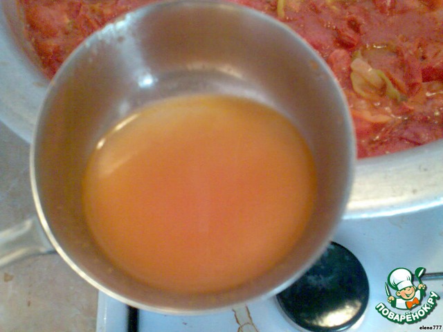 Вернёмся к помидорам. Когда помидоры закипят и начнёт выделяться розоватая жидкость (которую обычно и выпаривают по 3-4 часа), не перемешивая делаем в них углубление типа воронки и осторожно половником сливаем эту водичку, до тех пор, пока масса не станет густой.