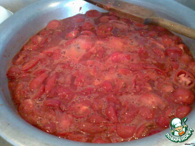 Помидоры порезать на 2-4 части и поставить варить на 45 минут.