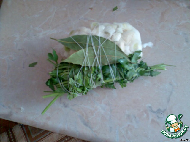 В марлевый мешочек ложим чеснок, петрушку и лаврушку. Я положила чеснок в капроновый мешочек и к нему примотала нитками петрушку с лавровым листом. Вот так.