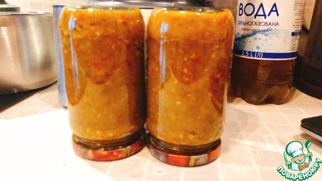 За 10 минут до окончания варки добавляем уксус, затем перекладываем в банки. Стерилизация не нужна. Выход по данному рецепту ровно 1 литр. Если больше – значит, «Айвар» сварен неправильно (недоварен). В правильно сваренном «Айваре» ложка должна стоять!