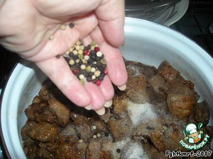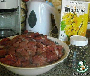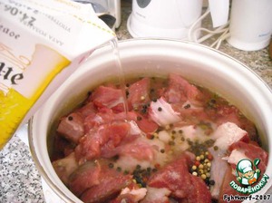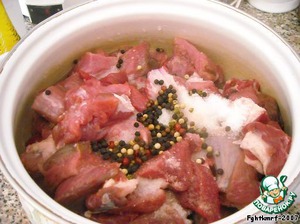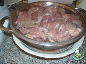Мясо около 2,5-3 кг нарезается как на шашлык и маринуется в вине (с добавлением перца и соли) сутки.
