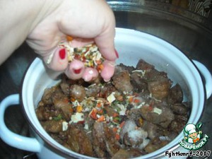 Мясо перекладываем в чугунок (у меня кастрюля, и готовила я в аэрогриле).