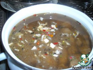 Та как я делала в аэрогриле, пенку мне снимать не пришлось, ее просто нет. Поэтому у меня закладка была сразу. (Особенность гриля в том, что и при варке супов, и тушении мяса не образуется пенка. Бульон становится мутным, потом совсем мутным, и в какой-то момент он светлеет. На плите замучалась бы пенку снимать, здесь же её просто нет).