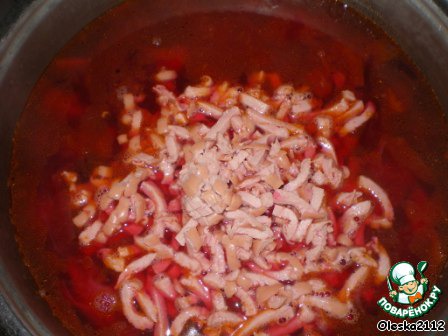 За 10 минут до окончания варки кладём в борщ мясной набор: отварную говядину, окорок и сосиски, порезанные мелкой соломкой или кубиком. -