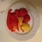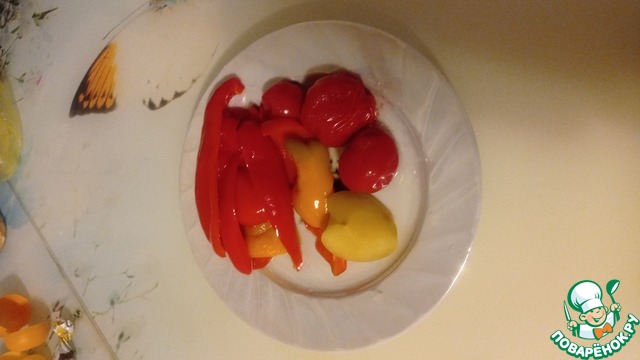 На дно каждой баночки кладу 3 -4 зубочка (небольших)чеснока. Перец порезать на 4 -5 частей, укладываю в баночки + дольки яблок. Примерно одинаково перца и яблок. Ну, может перца чуть больше.