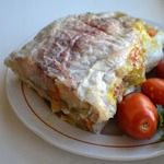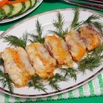 Рулет застыл, было много жидкости в пакете для выпечки (от рыбы), форму свою держит, но при нарезании крошится.