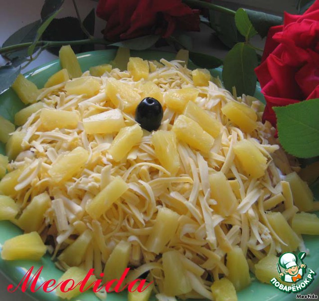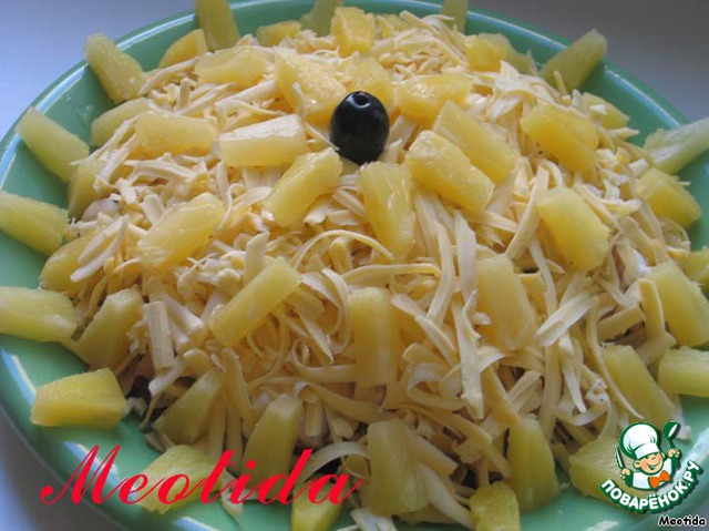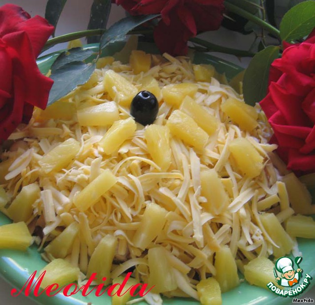 Осень - пора желтых... оранжевых и багряных красок... пора яркого пьянящего солнца... душистых прелых листьев... сочных спелых фруктов и восхитительных овощей... и в это же время она такая хмурая... серая и дождливая... с грязными лужами по колено и холодным пронизывающим ветром... такая разная словно огонь и вода.. лед и пламя... вот и салатик такой же как эта дивная пора... с разными и такими противоположными вкусами: сладость консервированного ананаса и блинчиков в сочетании с остротой и сытностью жареной курочки и грибочков... под легким одеялом копченого сыра... вкусный.. сытный.. необычный и очень интересный вкус салата не отставит равнодушным ни одного Вашего гостя..