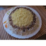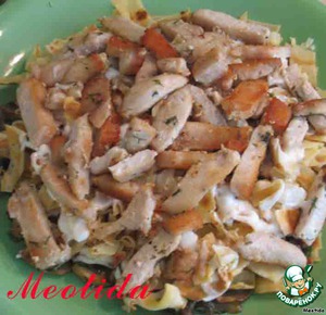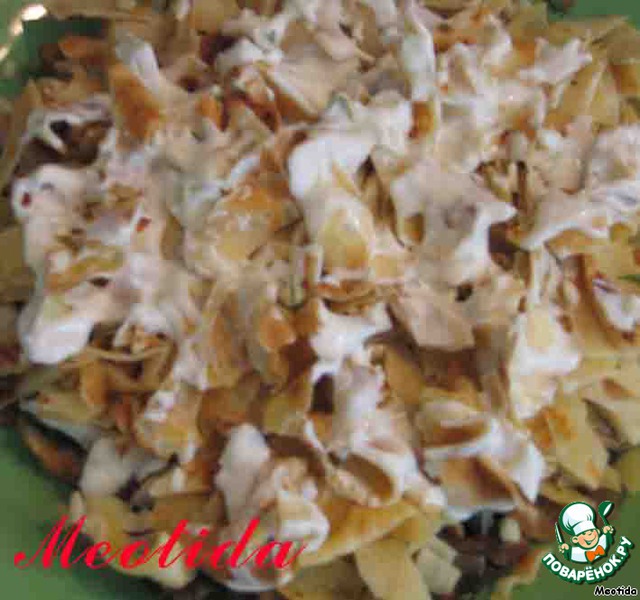 выкладываем слой курочки, также смазываем майонезом или сметанно-горчичной заправкой -