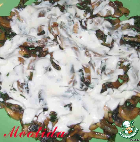 Выкладываем слой грибочков на большую тарелку, слегка смазываем майонезом или сметанно-горчичной заправкой