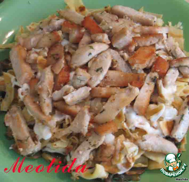 Курочку нарезаем брусочками и обжариваем до золотистой корочки в небольшом количестве масла на раскаленной сковородке