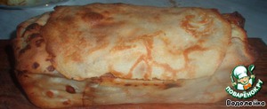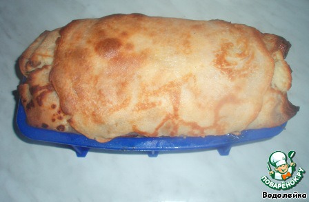 Теперь форму смазать маслом и выложить блины (несколько штук) так, чтобы они закрыли бока и дно формы и по краям немного свисали.
