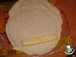 Выкладываем сыр на лаваш и скручиваем. Еще раз. Не рекомендую резать сыр мелко. Брусочками гораздо вкуснее и сочнее.