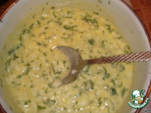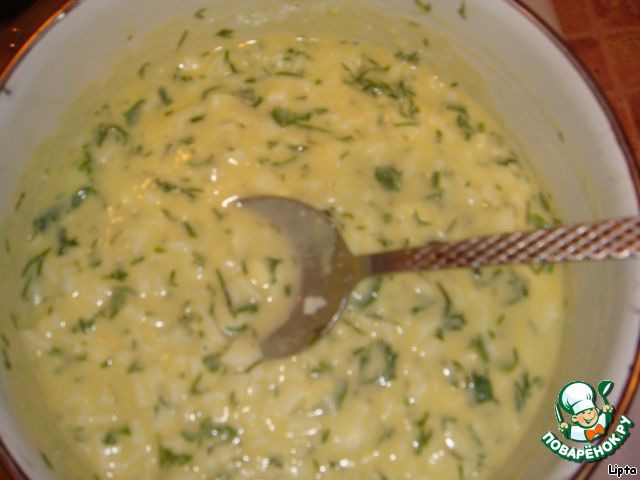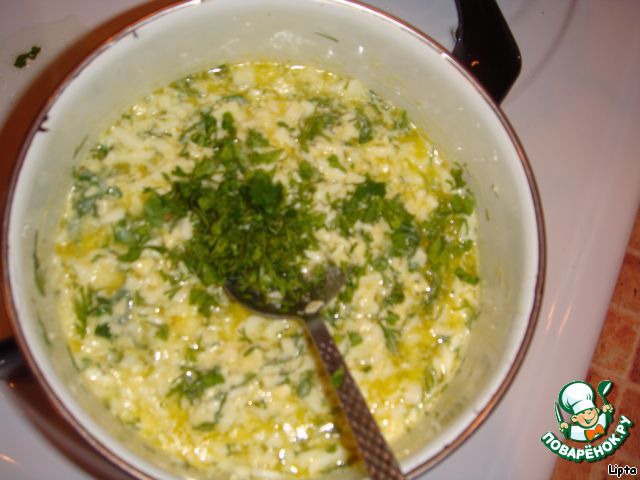 Сливочное масло растапливают, соединяют с подготовленными яйцами и зеленью.