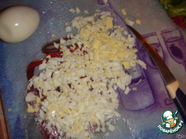 Яйца варят вкрутую, охлаждают, очищают и мелко шинкуют. -
