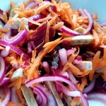 Отварная холодная говядина с полусырой свeклой и сырой морковкой..