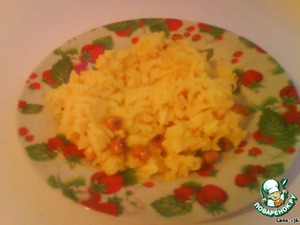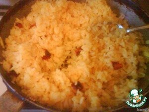 Хорошо мешаем, чтобы рис весь стал желтым, после чего добавляем арахис.