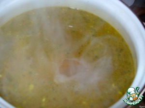 Бульон снова поставить на огонь, довести до кипения, положить в него куски курицы, зажарку и "Вегету".