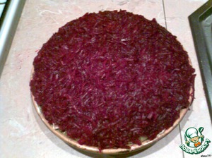 Сверху на огурчики - свёклу, натёртую на крупной тёрке, прежде вынув сердцевинку спиралькой для украшения.