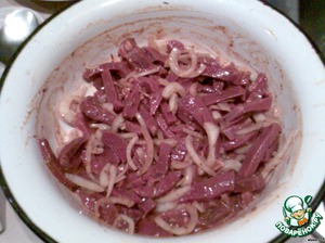 Сердце (у меня было телячье) порезать соломкой, посолить, поперчить, добавить приправы, одну луковичку, порезанную соломкой, яблочный уксус и ложку жидкого дымка - он придаст вкус шашлычка - оставить мариноваться.
