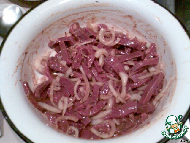 • Сердце (у меня было телячье) порезать соломкой, посолить, поперчить, добавить приправы, одну луковичку, порезанную соломкой, яблочный уксус и ложку жидкого дымка - он придаст вкус шашлычка - оставить мариноваться.