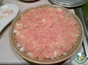 На рис кладем обжаренные овощи, майонезом пока смазывать не надо, рис будет и так сочным от овощей и тушёного сердца.