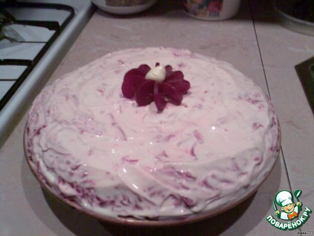 • Смазываем верх салата майонезом, украшаем цветочком из свеколки (отсюда и вышло у нас название - "Цветок на сердце")
