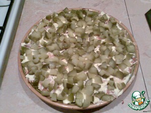 • На овощи выкладываем порезанный кусочками или соломкой омлет, смазываем майонезом.