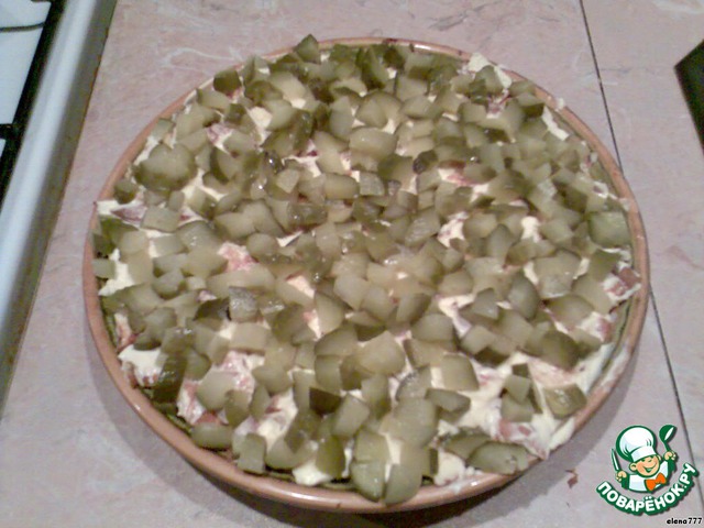 Салатик готов. Его даже и пропитывать не надо долго, только немного остудить, потому что все продукты я укладывала тёплыми, для лучшей пропитки.