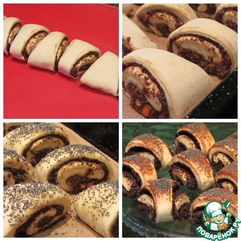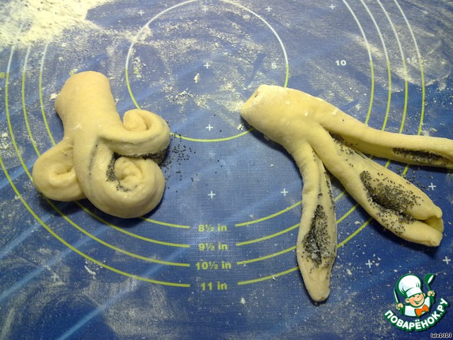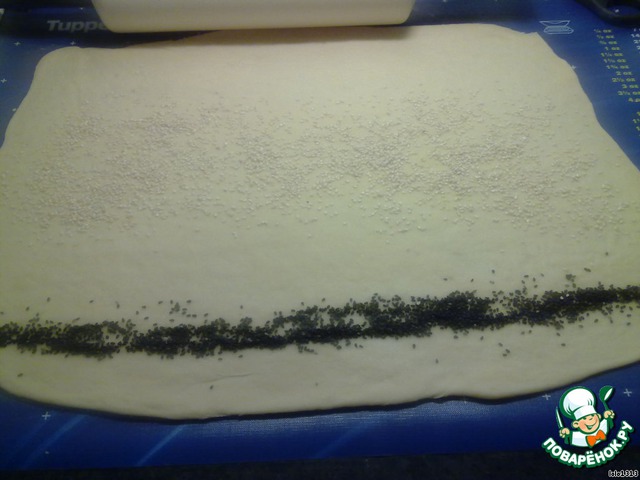 Теперь можно сформировать несколько булочек "ТРЕУГОЛьНИКИ". Для этого раскатать небольшой кусок теста, разложить на нём с одного края полоску мака, а на остальную часть разложить кунжутные семечки.