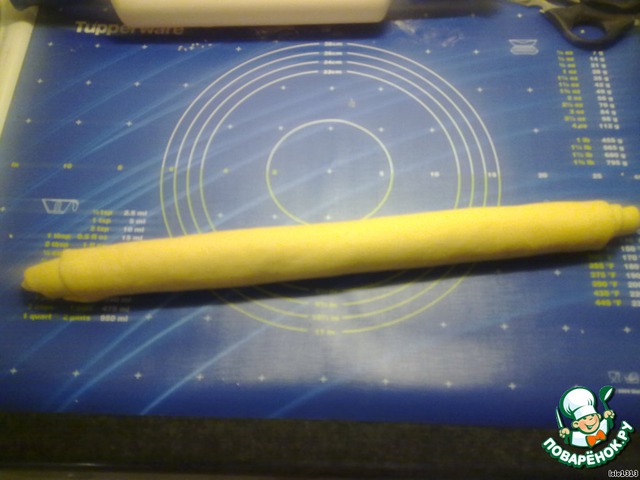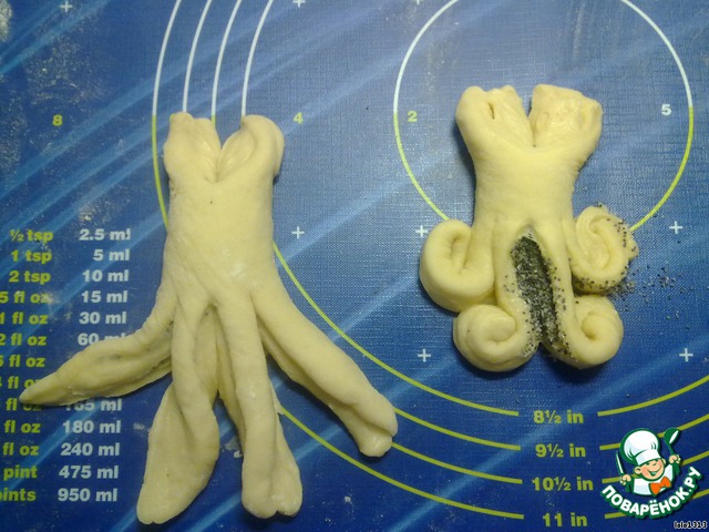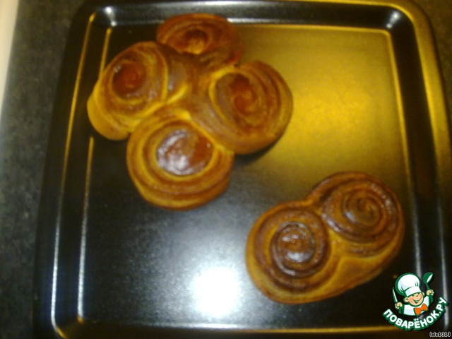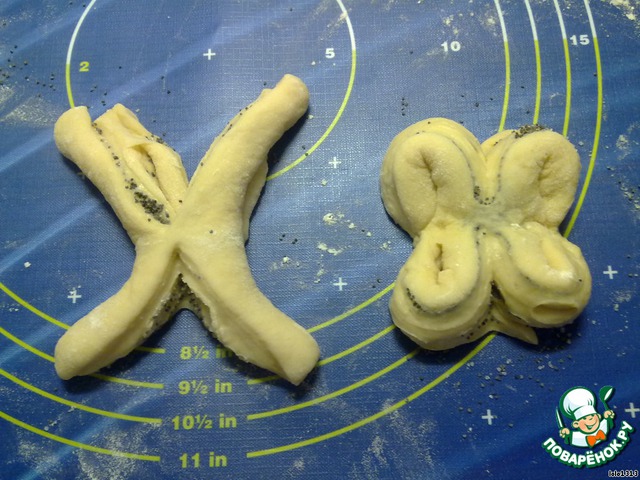 На рулетике сделать надрезы посередине с противоположных сторон, отсоединить концы согласно картинке... Выпекать при температуре 220 градусов (аналогично, в каждой духовке температура разная) примерно 10 минут.