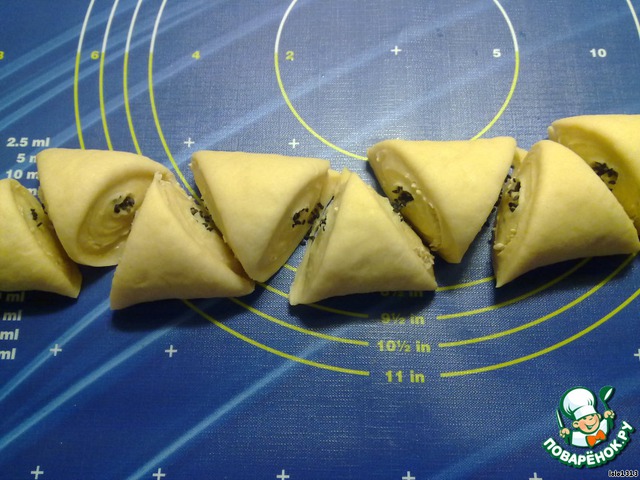 Теперь разрезать рулет на треугольнички. Смазать их взбитым желтком (с добавлением небольшого количества молока). "Треугольники"готовы к выпечке.