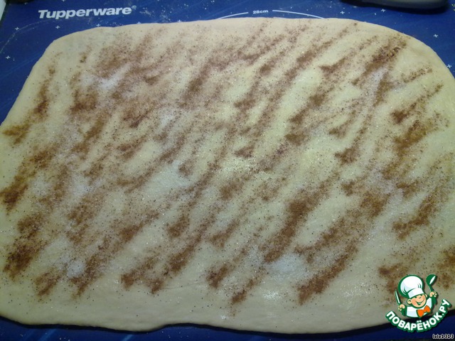 Теперь можно сформировать несколько плюшек. Опять же из небольшого куска теста раскатать пласт, смазать его сливочным маслом, посыпать сахарным песком и корицей.