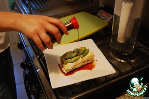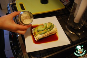 Щедро поливаем соевым соусом. Можно лить как на сыр, так и вокруг него. В первом случае сыр и авокадо сверху уже будут чуть солоноваты.