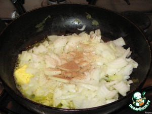 Лук обжарить на сковороде в сливочном масле с мускатным орехом, тушить 2 минуты.