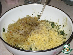 Добавить взбитые слегка яйца, вымесить. Затем добавить шпинат, щавель, зелень, натертый сыр, обжаренный лук. Посолить, поперчить и перемешать начинку.