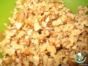 Тем временем острым ножом мелко рубим грецкие орехи (можно измельчить в блендере, если не очень нравится выраженный ореховый вкус). Чеснок мелко рубим.