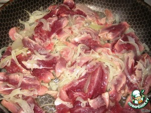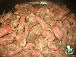 Луковицу нарезаем полукольцами, тушим в глубоком сотейнике на медленном огне с добавлением масла до прозрачного состояния. Добавляем мясо, нарезанное полосками, и накрываем крышкой. Тушим также на медленном огне, под крышкой минут 10-15