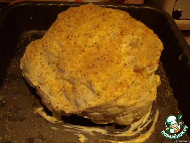 Обмазать ее майонезом с чесноком, посыпать сверху панировочными сухарями, и отправить в духовку (200 градусов, 20 минут)