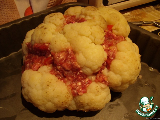 Сваренную капусту нафаршировать, как можно плотнее укладывая фарш между соцветиями