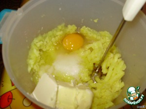 Картофель измельчаем в пюре, добавляем маргарин, яйцо, все перемешиваем в однородную массу