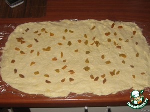 Тесто наше выкладываем на пищевую пленку и разминаем руками. посыпаем тесто изюмом, и выкладываем яблоки.