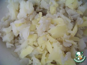 • Рыбу (я брала горбушу в собственном соку) вилкой давим, но не совсем мелко, то есть не до однородности, а так, чтобы все-таки были кусочки.
