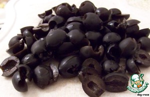 Режем оливки, у меня были мелкие, и я каждую разрезала пополам
