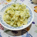 Как картошечка приготовилась, сливаем воду и добавляем укроп, майонез и чеснок, закрываем кастрюлю крышкой и энергично встряхиваем. Далее закутываем кастрюлю чем-нибудь тёплым и оставляем на 15 минут.