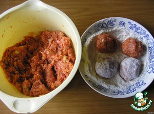 Сформовать из фарша биточки - шарики диаметром 3-4 см. Обвалять несколько раз в муке.