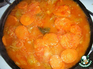 Разогреть на сковороде масло, добавить муку, томатную пасту, бульон, лук и морковь кольцами, соль, сахар, довести до кипения.