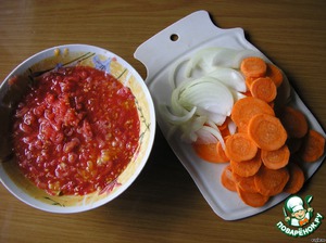 Взять приготовленные для маринада овощи и томат, я использовала натертые на терке помидоры