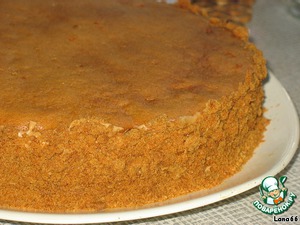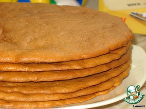 У меня получилось 7 коржей. Не складывайте их в горячем или теплом виде, они могут приклеится друг к другу. Последний корж подержите подольше в духовке. Он пойдет на обсыпку боков нашего торта.
