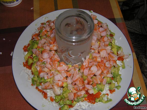 В центр большого блюда помещаем стакан. Вокруг него выкладываем первый слой - кальмары.