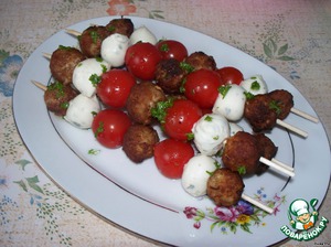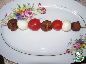 Теперь нанизываем на каждую палочку фрикадельку, моццареллу, помидорчик, фрикадельку, помидорчик, моццареллу и фрикадельку.